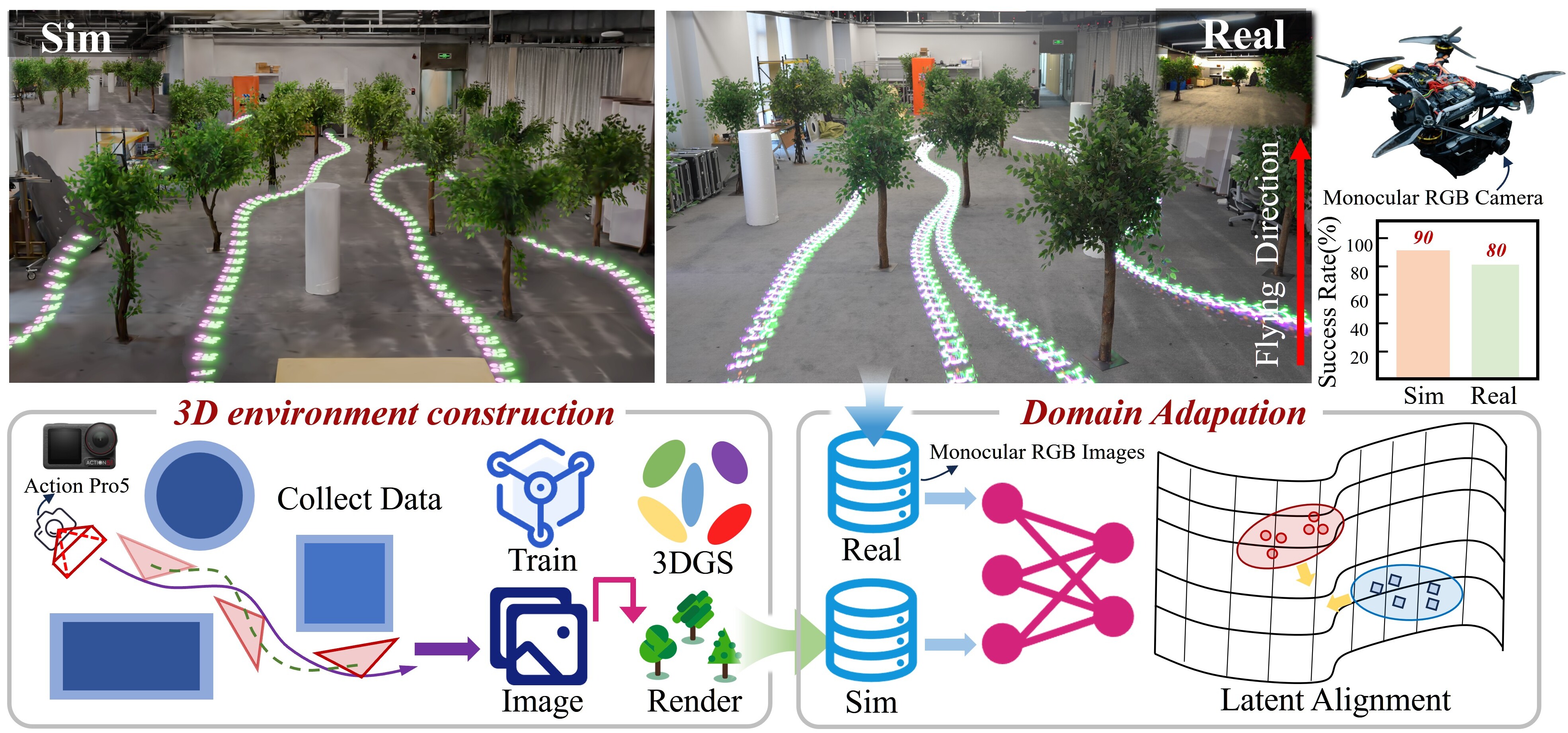 This work presented a method for autonomous high-speed flight in complex environments using only monocular RGB cameras, trained within 3DGS.